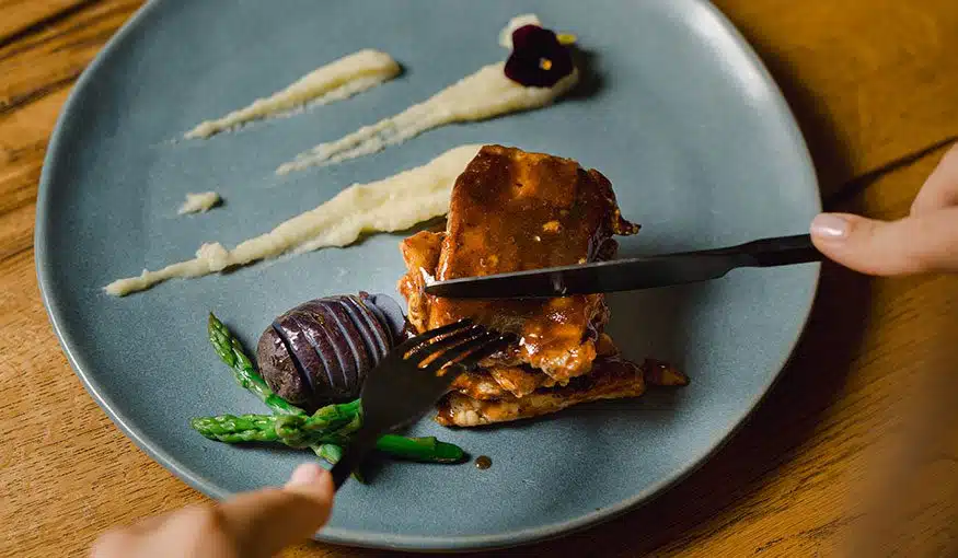 With glaze celeriac puree, grilled fennel, wine sauce and green aromatic olive